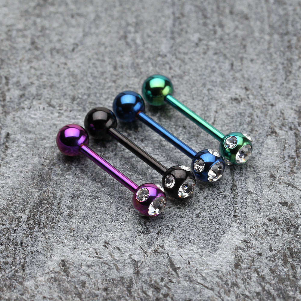 This Colorline PVD Aurora Gem Ball Steel Barbell Tongue Ring will give your tongue some serious bling bling! With many vibrant colors to choose from, you can be sure that your piercing will dazzle in any crowd. So why not add a sparkle to your style today?!