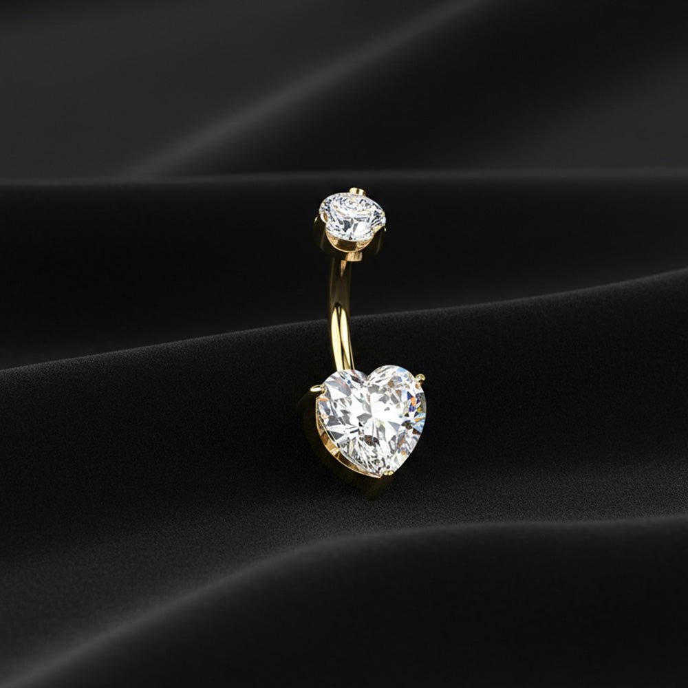 Make a statement with this heart-shaped moissanite belly button ring that sparkles like a dream. Built from implant-grade titanium, it's gentle on your skin and ideal for new piercings or sensitive skin. The internally threaded design glides in effortlessly for a comfortable fit every time. With its luxe 24K finish, you get that high-end glow at a price that won't break the bank. Playful, elegant, and endlessly wearable—this is the navel jewelry that steals the show.