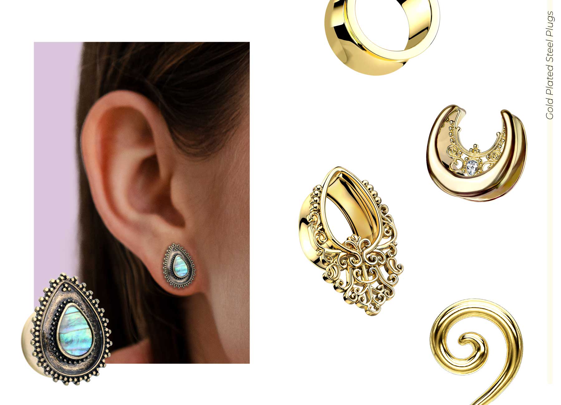 Shop our collection of gold-plated steel ear gauge plugs, the perfect combination of affordability and luxury. Our plugs, hangers, and ear weights, crafted from surgical steel and gold-plated, add a touch of elegance.