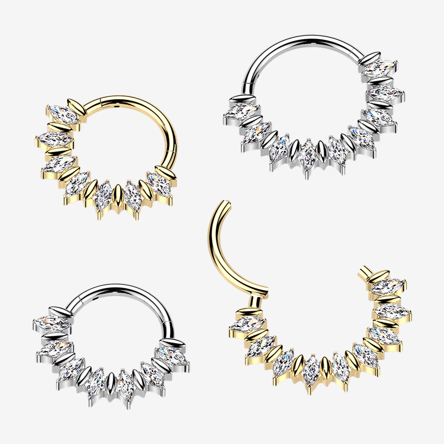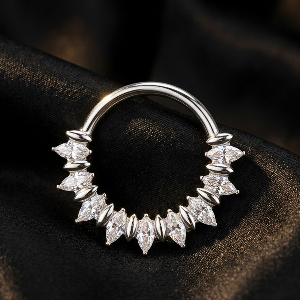 Own your edge with this striking clicker hoop that demands attention. Implant-grade titanium provides biocompatible durability for sensitive piercings, while marquise-cut moissanite stones arranged in an intricate floral pattern deliver uncompromising brilliance. The precision clicker mechanism clicks seamlessly into place, offering both security and style. Whether you're piercing your septum, daith, or cartilage, this ring transforms your look with fearless sophistication and undeniable sparkle that refuses to fade.