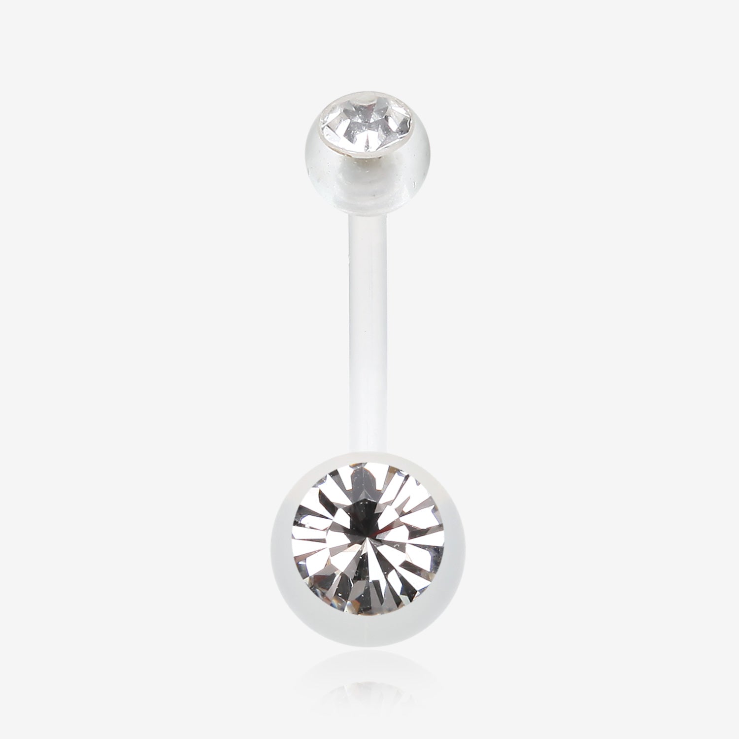 This belly button ring features a white, clear gem on a bio-flexible shaft. Its subtle beauty and comfortable material make it the perfect accessory for everyday wear.