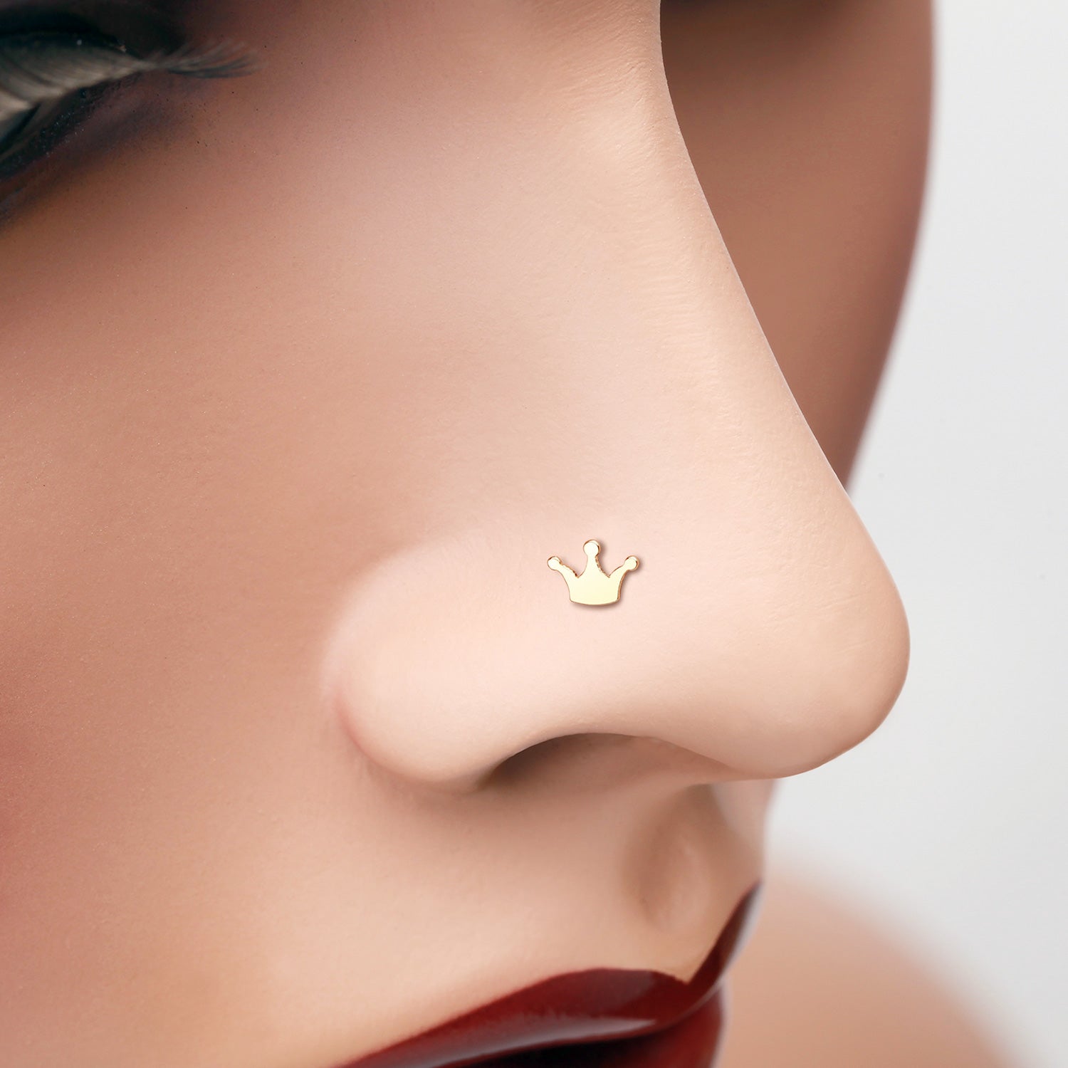 Feel like royalty with our Golden Dainty Princess Crown Icon Nose Stud Ring. Made with delicate golden metal, this nose stud features a miniature princess crown, adding a touch of elegance to any outfit. Elevate your style and embrace your inner princess with this stunning nose ring.