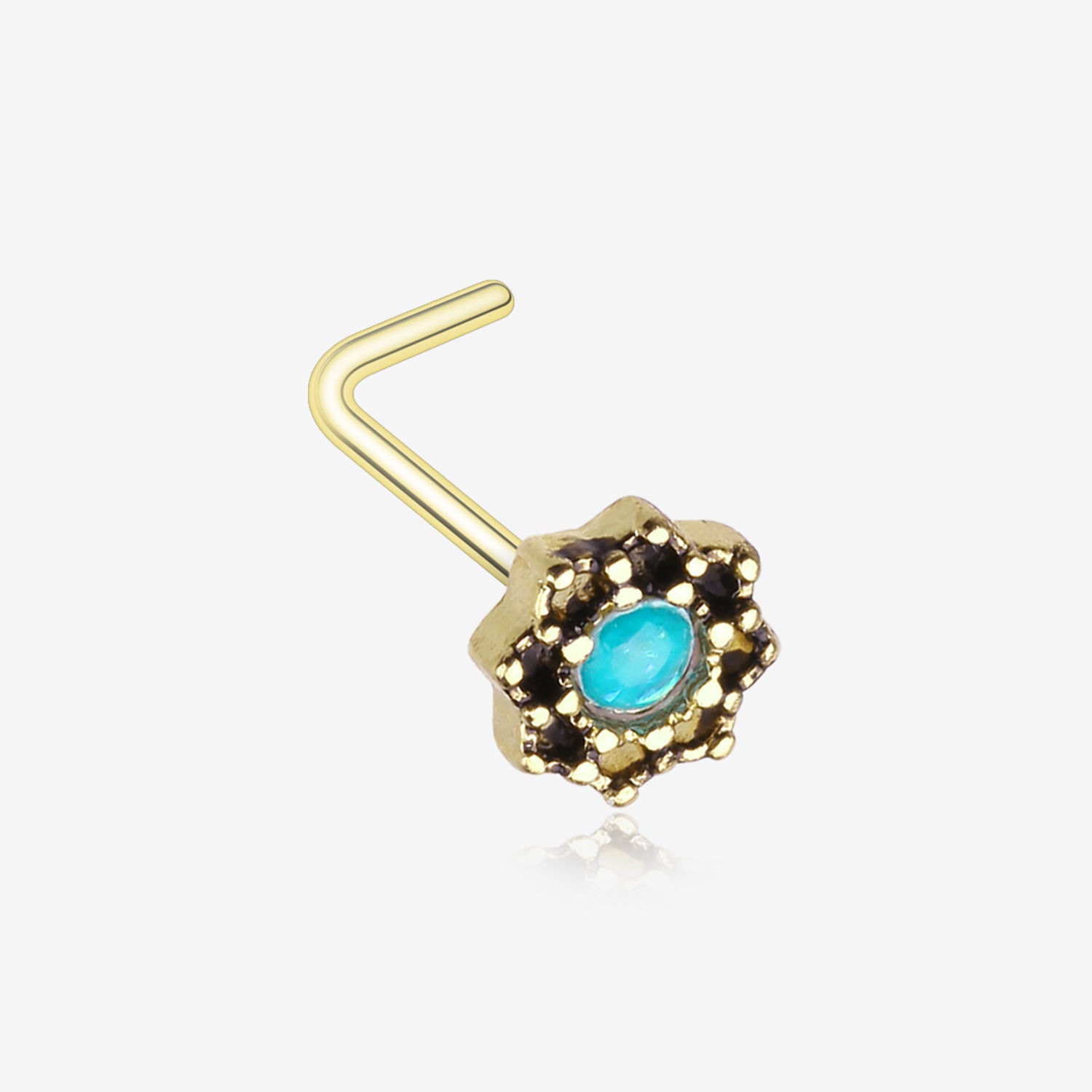 Add a touch of elegance to your look with our Golden Lotus Opal Sparkle Filigree Icon L-Shaped Nose Ring! The stunning design and high-quality opal sparkle will make you stand out in any crowd. Make a statement with this unique and beautiful piece.