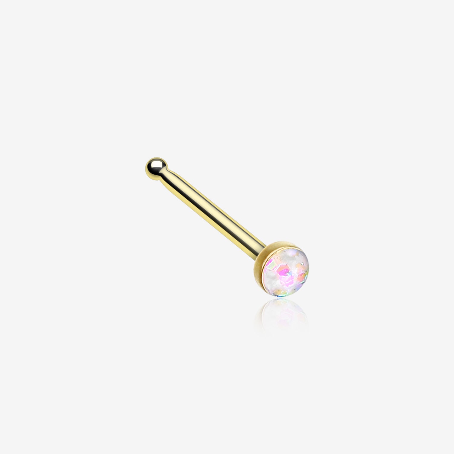 This stunning Golden Opal Sparkle Nose Stud Ring will add a touch of glamour to your everyday look. The shimmering opal stone is sure to catch the eye and the golden setting adds a warm and luxurious touch. Elevate your style and make a statement with this unique and elegant nose stud.