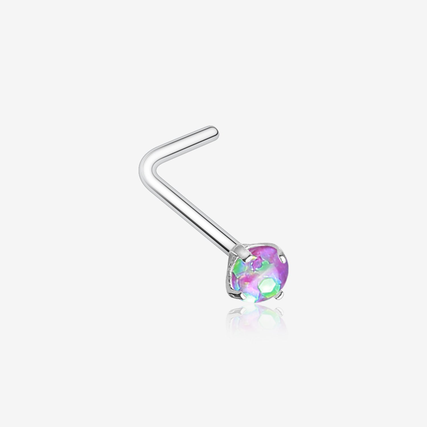 Enhance your look with our stunning and stylish Opal Sparkle Prong Set L-Shaped Nose Ring! Adorned with a glittering opal stone and expertly crafted for a secure fit, this nose ring will add a touch of elegance and sparkle to your everyday style.