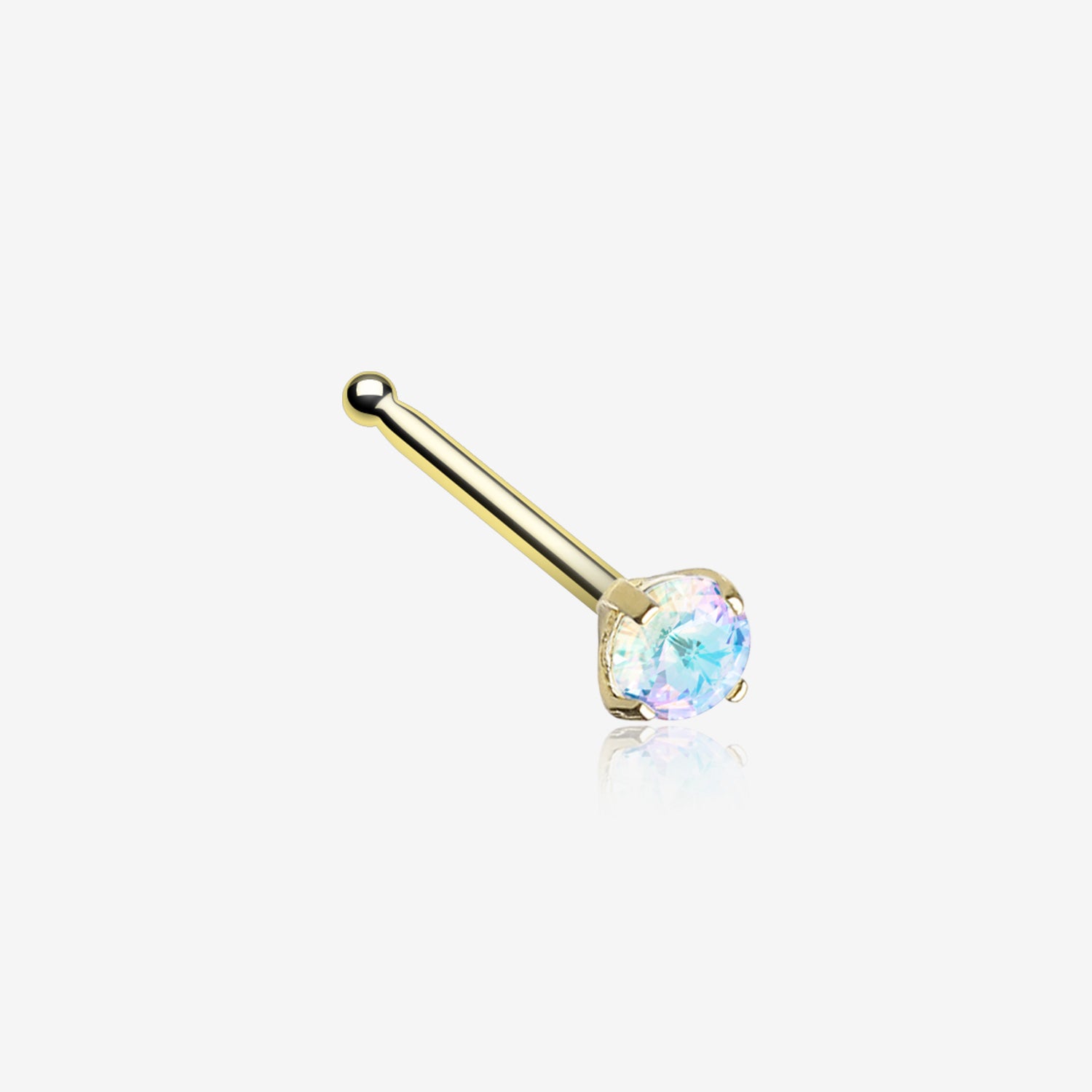 Add a touch of elegance to your look with our Golden Iridescent Sparkle Gem Prong Set Nose Stud Ring! The golden hue of the stud complements any skin tone, while the iridescent sparkle gem captures attention and exudes a sense of luxury. Perfect for any occasion, this nose stud will elevate your style game!