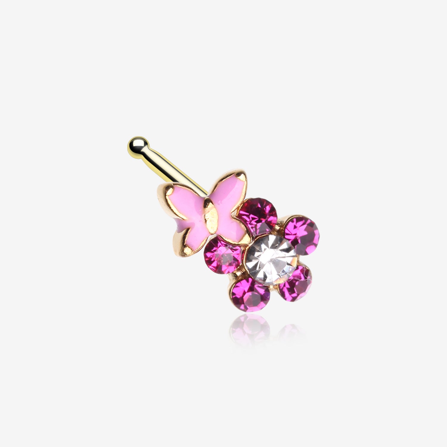 Transform your look with the Golden Pink Butterfly Flower Sparkle Nose Stud Ring. This stunning piece adds a touch of elegance and sparkle to any outfit. The delicate butterfly and vibrant pink flower design will catch everyone's eye, while the golden accents add a touch of sophistication. Perfect for those who want to make a statement.