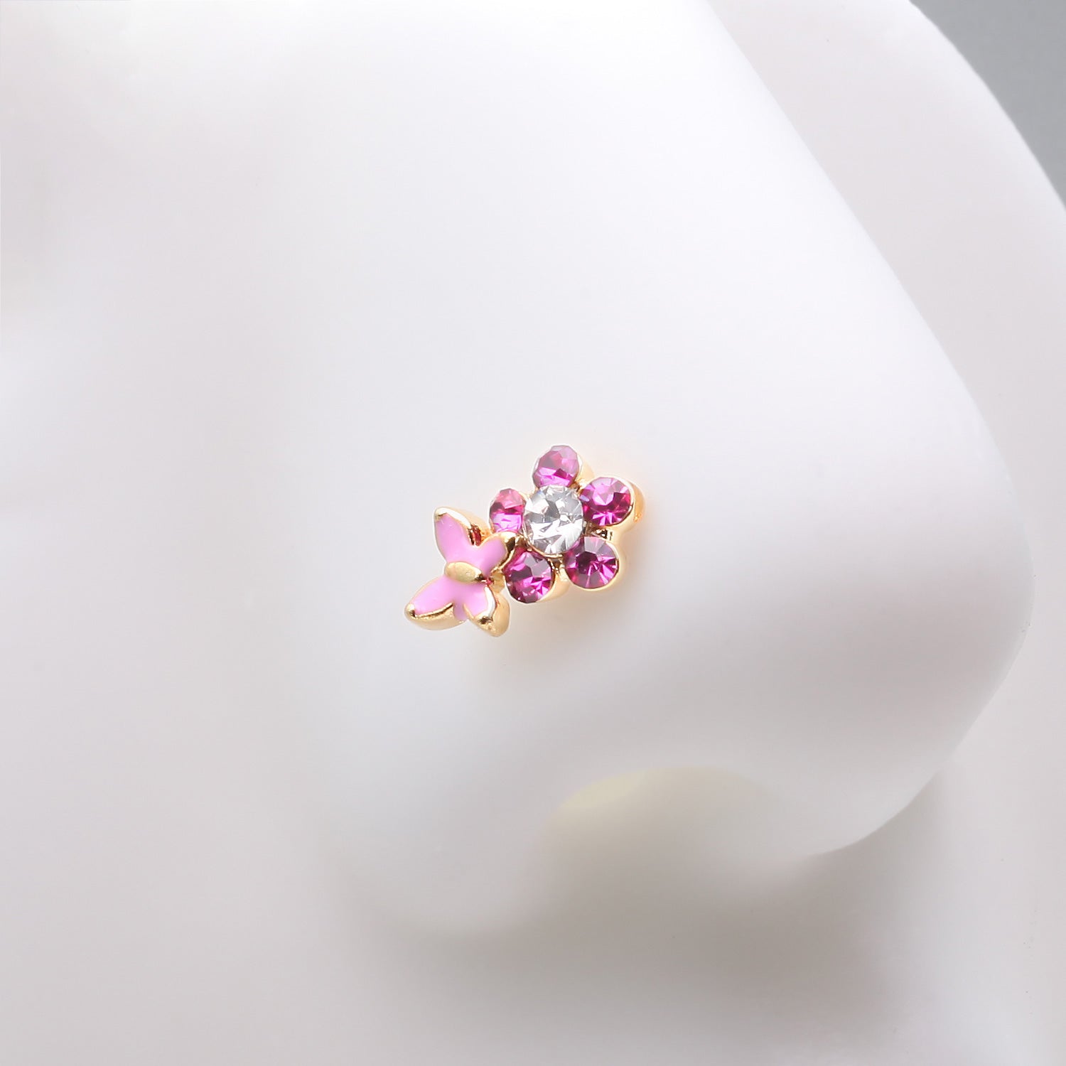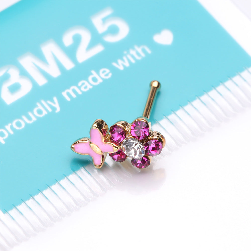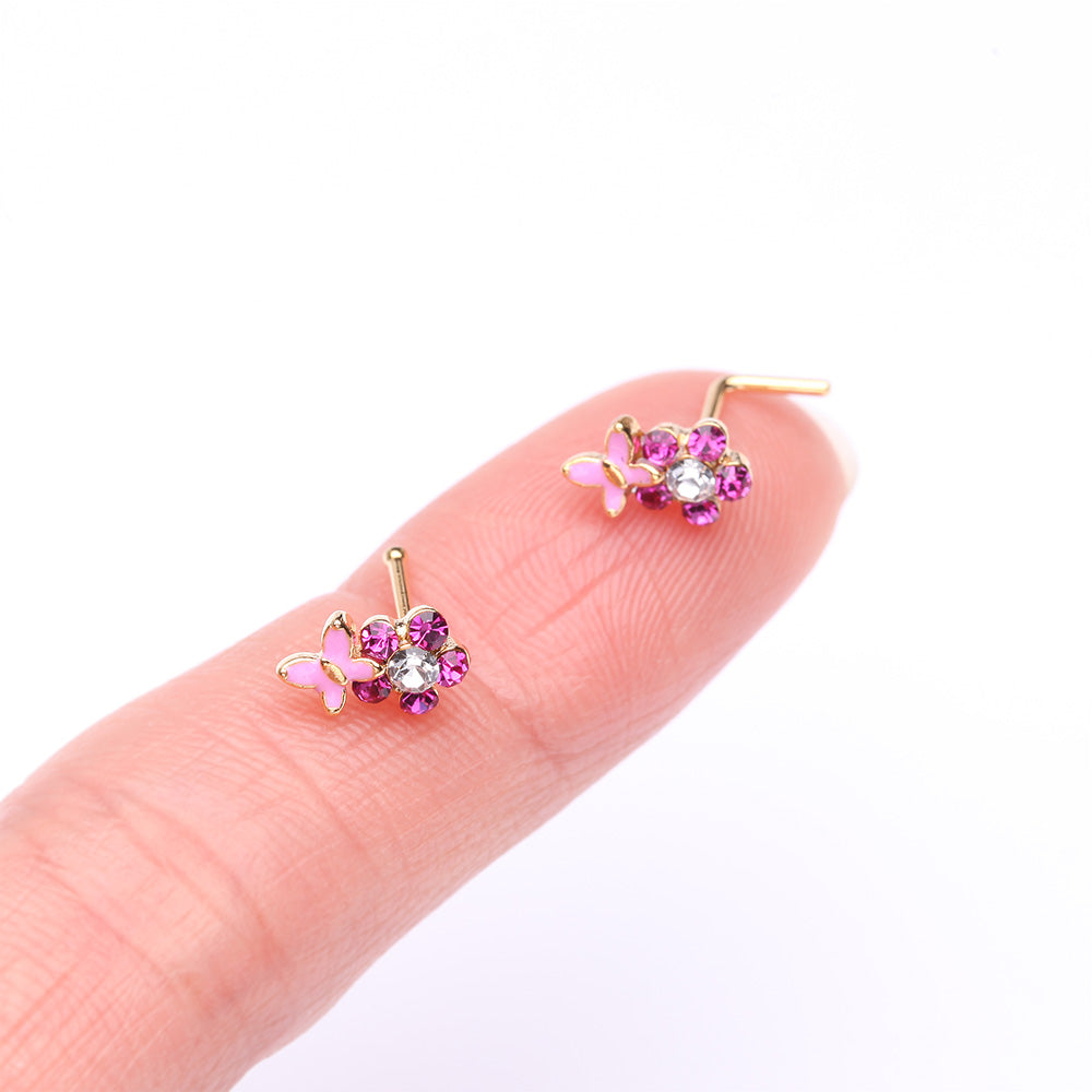 Golden Pink Butterfly Flower Sparkle Nose Stud Ring