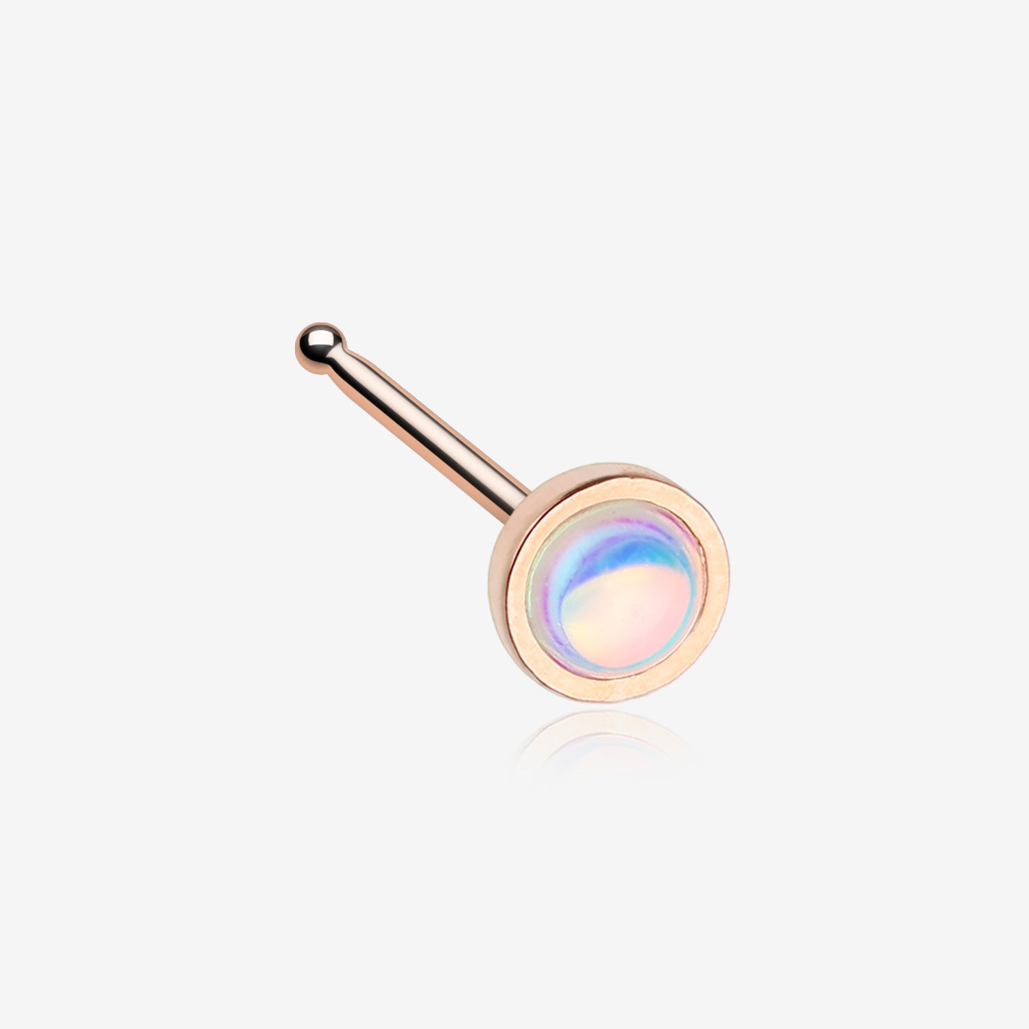Elevate your style with our Rose Gold Bezel Set Iridescent Revo Sparkle Nose Stud Ring. The beautiful rose gold bezel paired with the iridescent sparkle adds a touch of elegance to any outfit. Stand out from the crowd and shine with confidence.