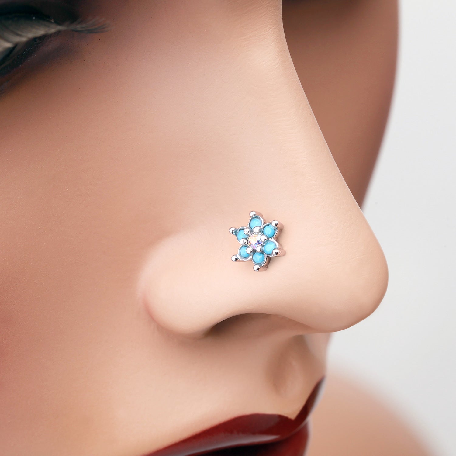 Enhance your natural beauty with our Spring Flower Turquoise Sparkle Nose Stud Ring. The stunning turquoise flower design exudes femininity and adds a pop of color to your look. Made with high-quality materials, this nose stud offers comfort and durability, perfect for everyday wear. Add a touch of sparkle and style to your nose piercing!